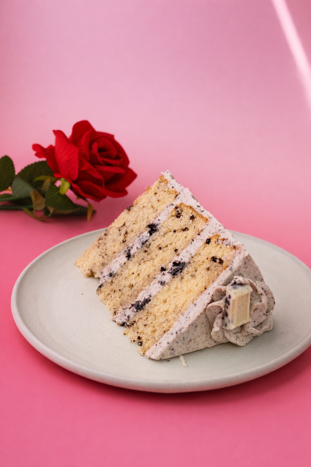 Three layers of Oreo filled Cake layered with oreo buttercream and oreo pieces.
