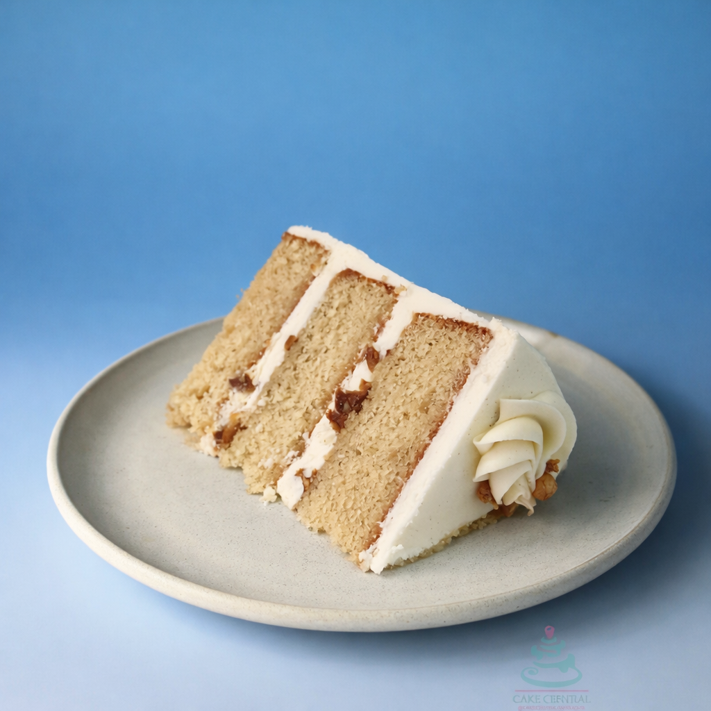 Layers of Apple Cake, soaked in a Apple Beer reduction and layered with vanilla buttecream and dried Apple pieces.