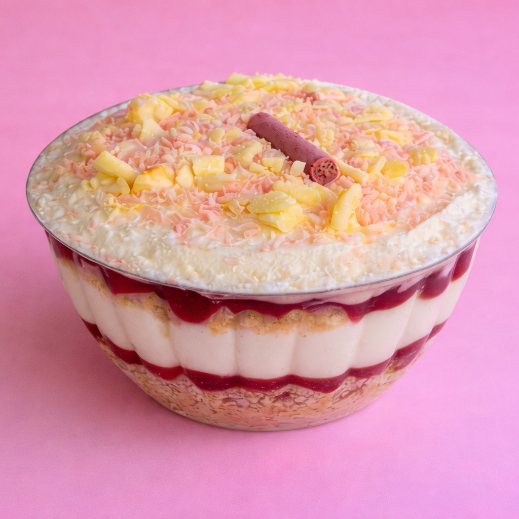 Layers of Vanilla Cake, Strawberry Compote, & White Chocolate Shards.